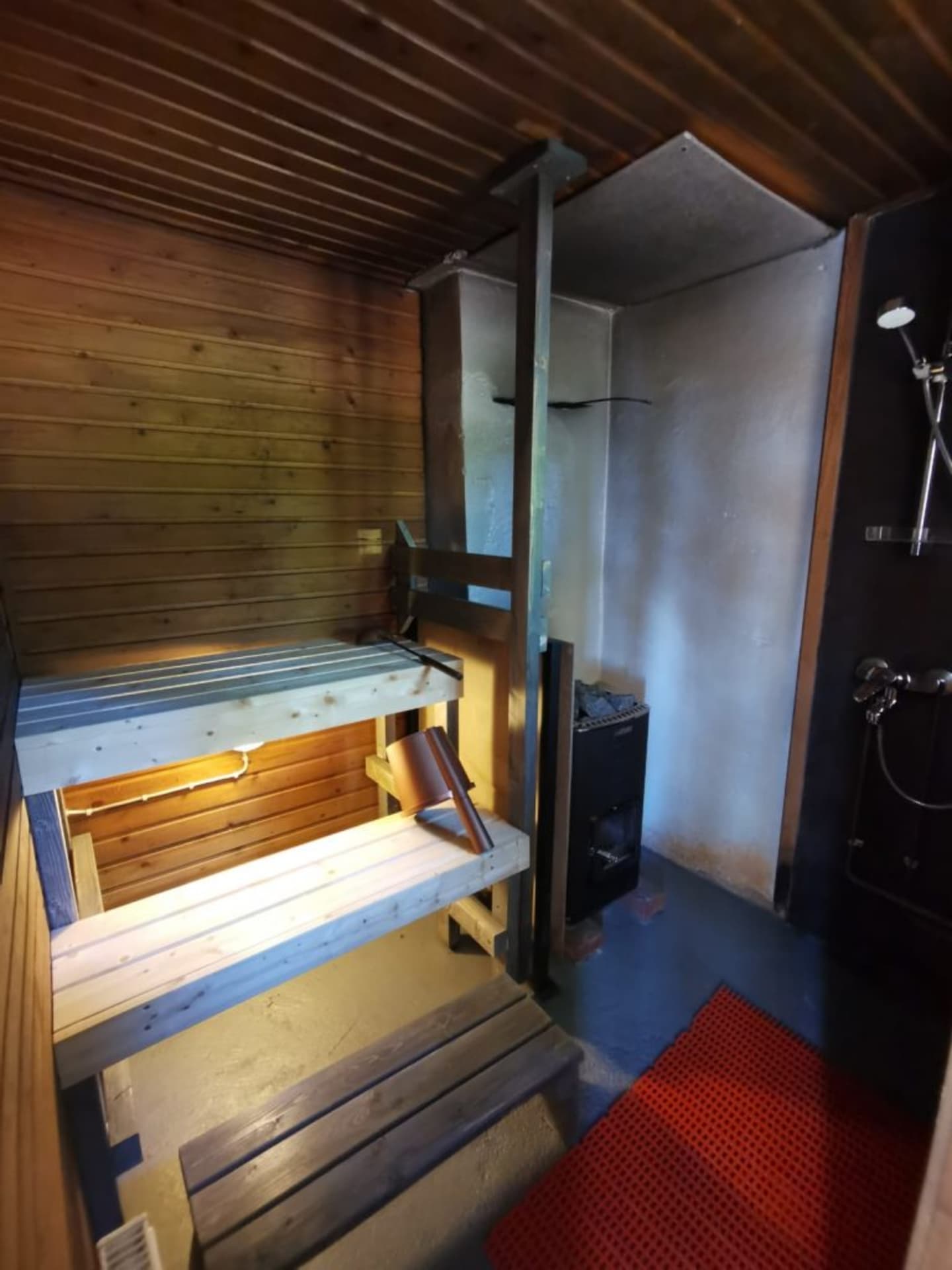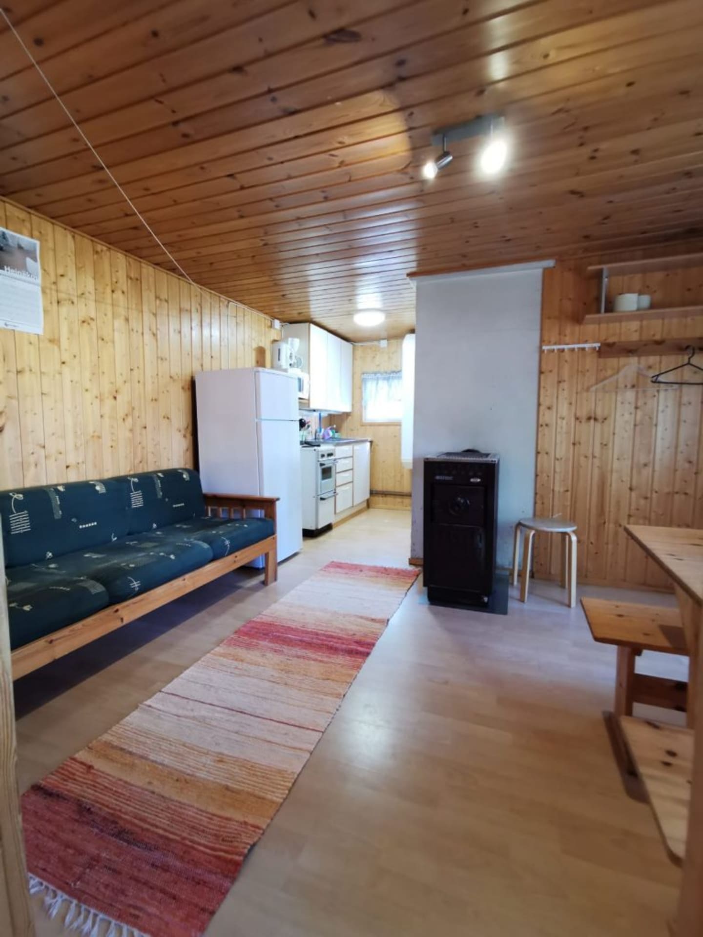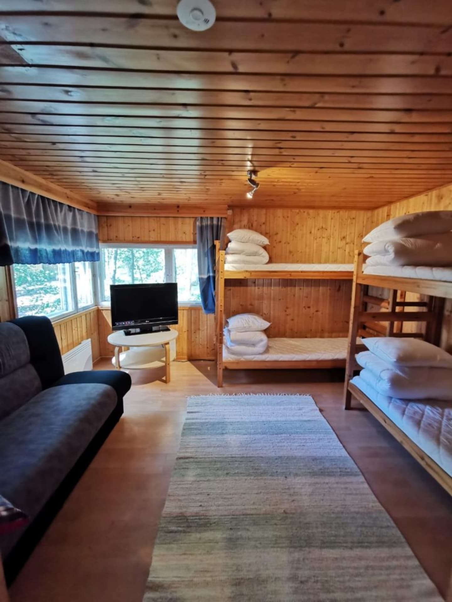 Two bunk beds in the living area and a sofa bed and television Mökissä on keittosyvennys ja ruokailutila, sauna sekä suihku. Toilet is in separate service building.